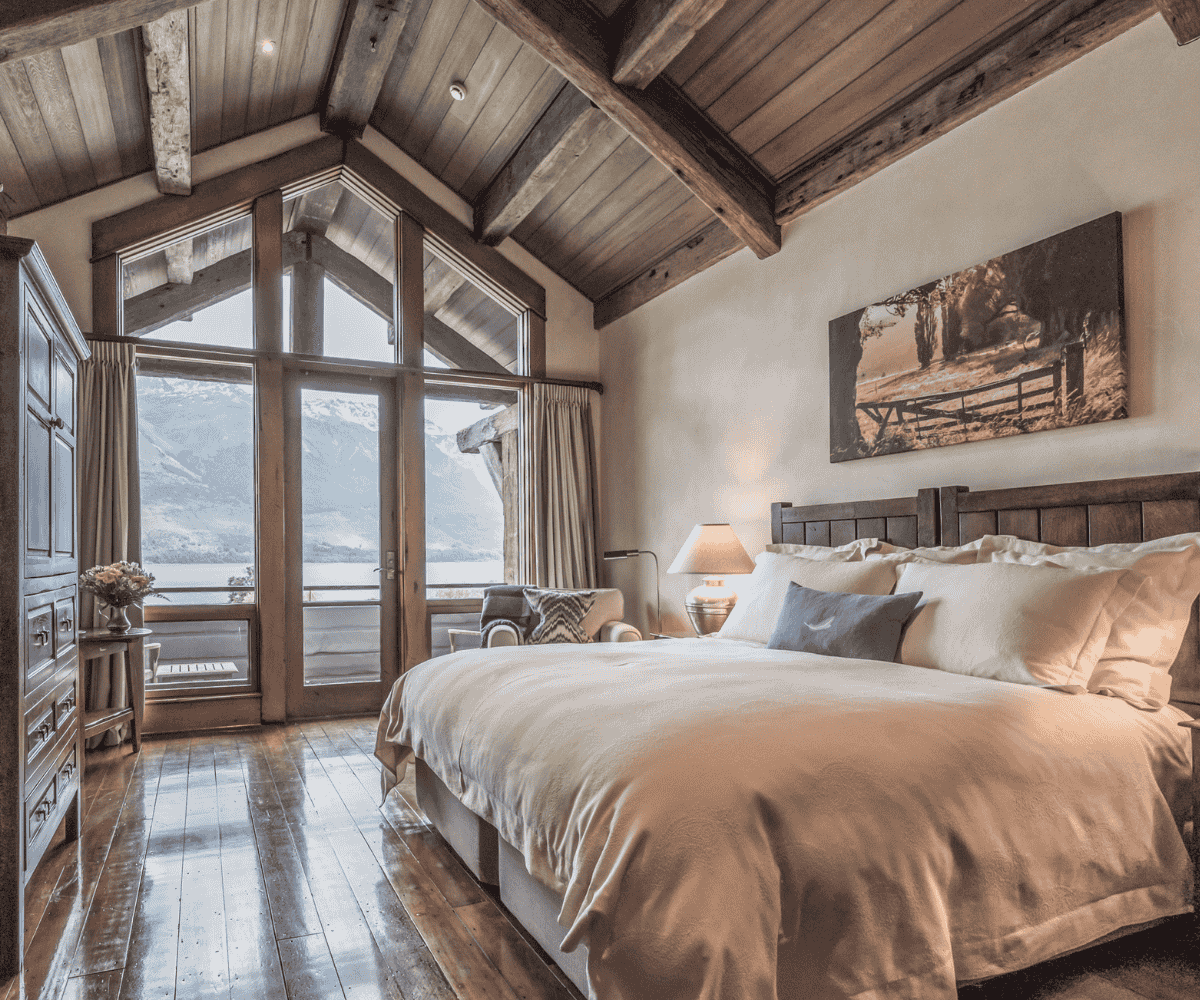 With its lofty ceiling and monumental stone fireplace, the great room becomes a gathering place as dusk settles. Here, guests share tales of their adventures over locally sourced cuisine and Central Otago wines. But the private moments leave lasting impressions, such as watching the alpenglow paint the mountains pink from your private terrace or taking a dawn kayak on the mirror-like lake.