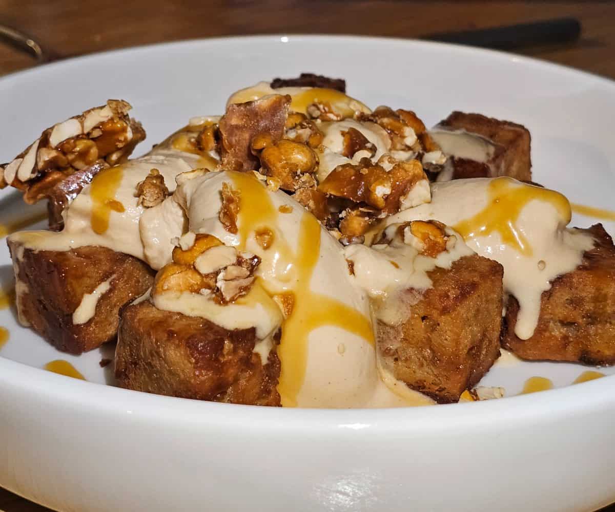 And the best is left to the end. For dessert, it’s “Armer Ritter” which literally translates to “Poor Knight” but is a common name for “Poor Man’s Bread Saver”, made with sourdough bread, and served with vanilla, peanut ice cream, salted caramel and peanut crumble – a fitting finale to an unforgettable meal.
